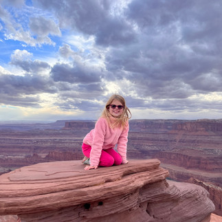 Day #96 (November 4, 2022): Today we awoke to a white winter wonderland in the desert! So pretty! With GuideAlong’s Mr. Dave as our tour guide, we drove into Canyonlands National Park, which is adjacent to Dead Horse Point State Park, and explored the portion of the national park called Island in the Sky, stopping at hikes such as Mesa Arch, Whale Rock, and Grand View Point. The canyon top was so pretty with its fresh dusting of white snow; the girls loved making snowballs and licking fresh icicles along the Mesa Arch hike. As we hiked throughout the day, we reminded one another about the importance of not being a “crust-buster,” a term that Mr. Dave uses for anyone walking off the trails and thus disturbing the extremely delicate and ever-important cryptobiotic soil crust found throughout the desert. And as we drove, we tried identifying and remembering the various rock layers by using Mr. Dave’s acronym “Oh What Massive Cliffs We Know Now.”